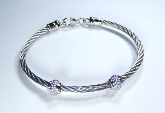 ~Women's Sterling Silver & Stainless Steel Diamond Twist Bead Bracelet Size = 7"