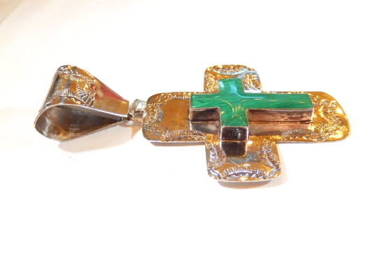 ~VINTAGE~ MEXICO STERLING SILVER AND MALACHITE LARGE CROSS PENDANT 3.75" TALL