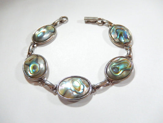 ~VINTAGE~ Hoffman Abalone Linked Bracelet Oval Silver Tone Chain Shell 7.25"