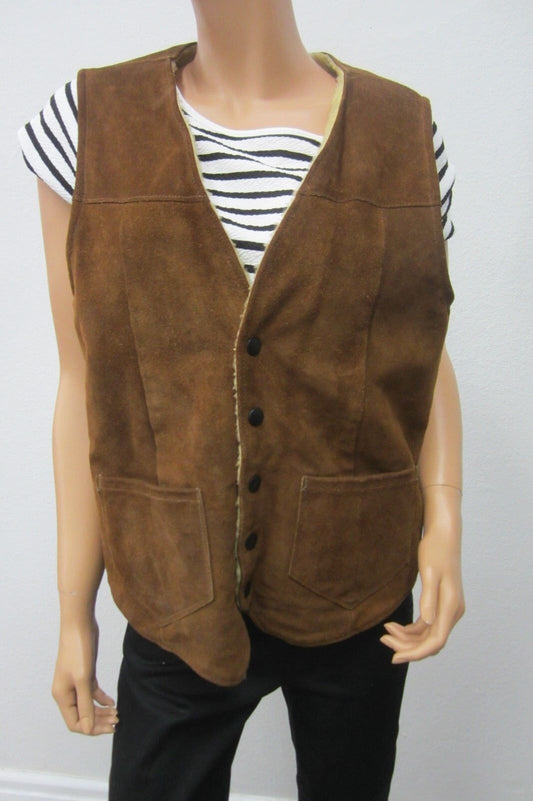 VTG JOO KAY-42-MED Suede Leather Vest Shearling Sherpa Lining Brown - USA Made