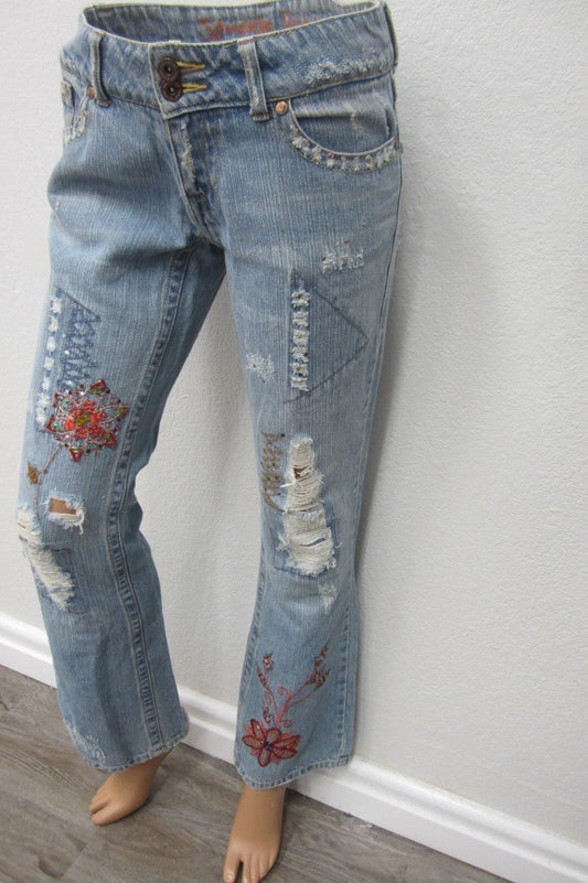 *VERY NICE* Squeeze Denim Distressed Floral Embroidered Blue Jeans Sz 3/4 x 31