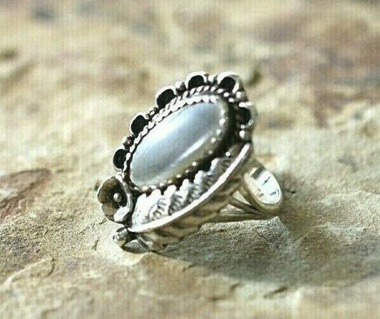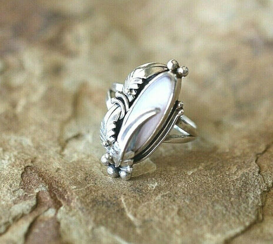 *VINTAGE* Native American Sterling Silver Feather Chalcedony Ring Size 6.5