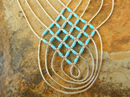 Turquoise 5 Strand Sterling Silver Native Amer. Bib Necklace Liquid Silver 17"