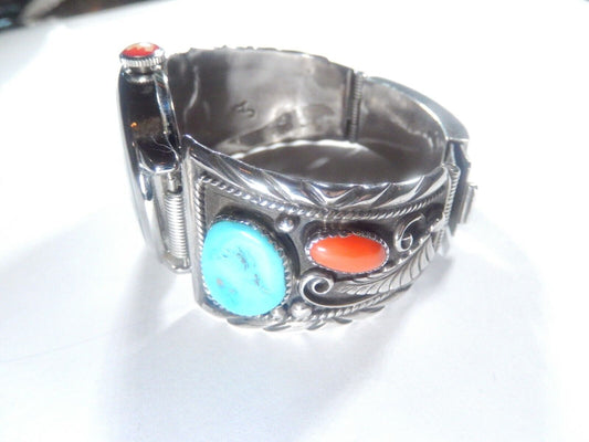 LARGE Sterling Silver Navajo "AJ" Handmade Natural Turquoise Watch Tip Bracelet