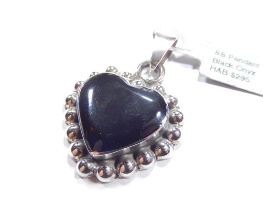 *VINTAGE* Mexico Artist TFT Sterling Silver Beaded Black Onyx Heart Pendant 1.5"