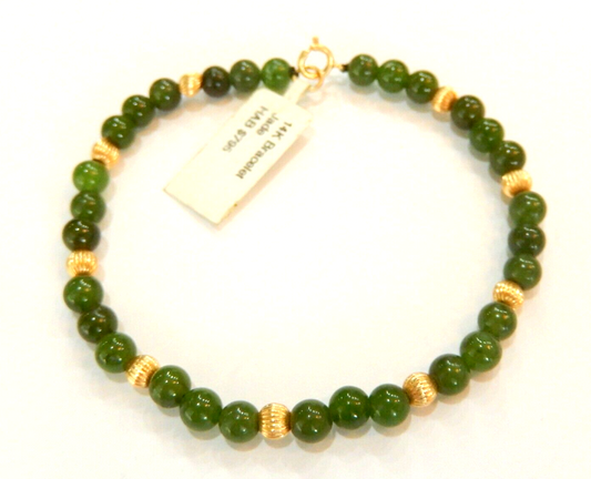14K 4mm Yellow Gold and 5mm Green Jade Bead Bracelet 7.25"