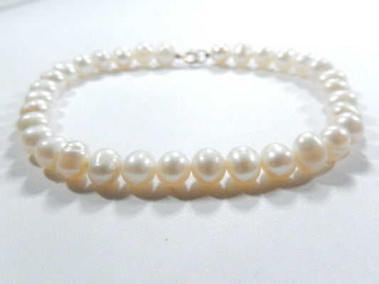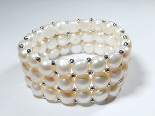 WIDE - Sterling Silver Bead Tripple Row 7.5mm Button Pearl Bracelet 1" Wide