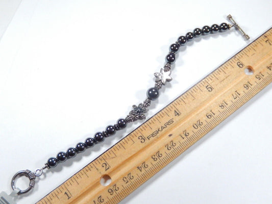 Oxidized Sterling Silver Marcasite Crystals & 6.5mm Hematite Beaded 7" Bracelet