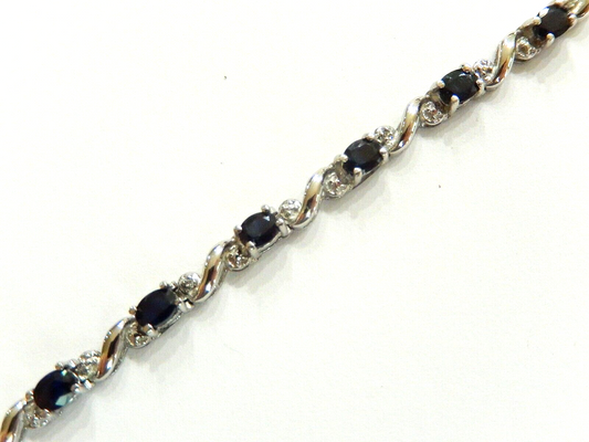 Stamped 10K White Gold Natural Blue Sapphire & Diamond Tennis 7” Bracelet