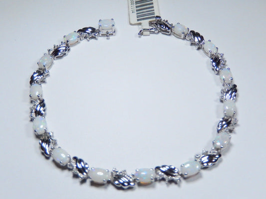 Stamped 14K White Gold Oval Opal & Natural Diamond Tennis Bracelet 7"