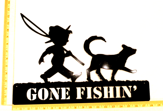 *NEW* Large 14ga. "GONE FISHING" Boy & Dog 18" x 12" Black Metal Wall Art Decor